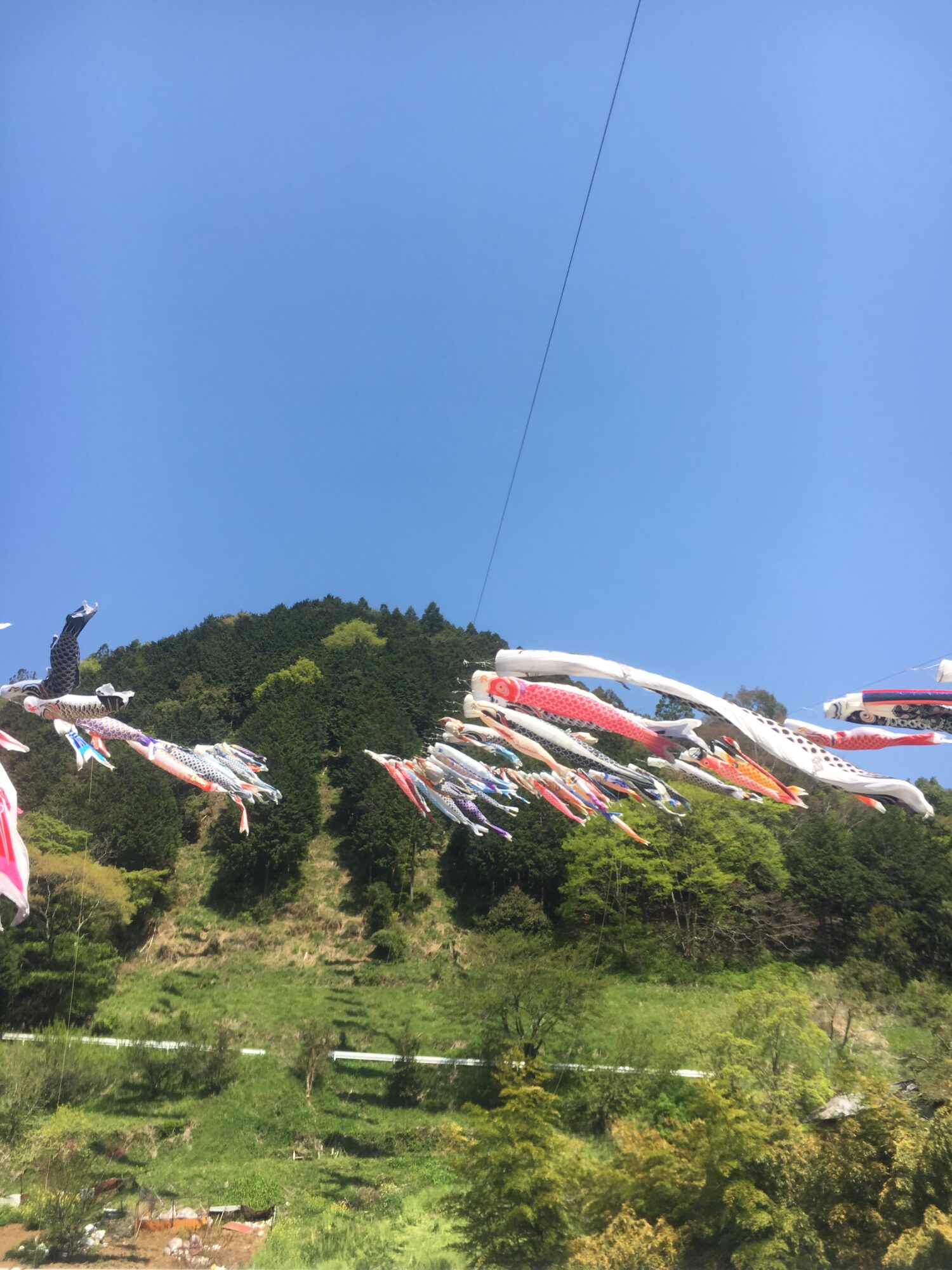 下山中の藤野北小?付近の川を跨いで鯉のぼりが元気よく泳いでいましたよ。